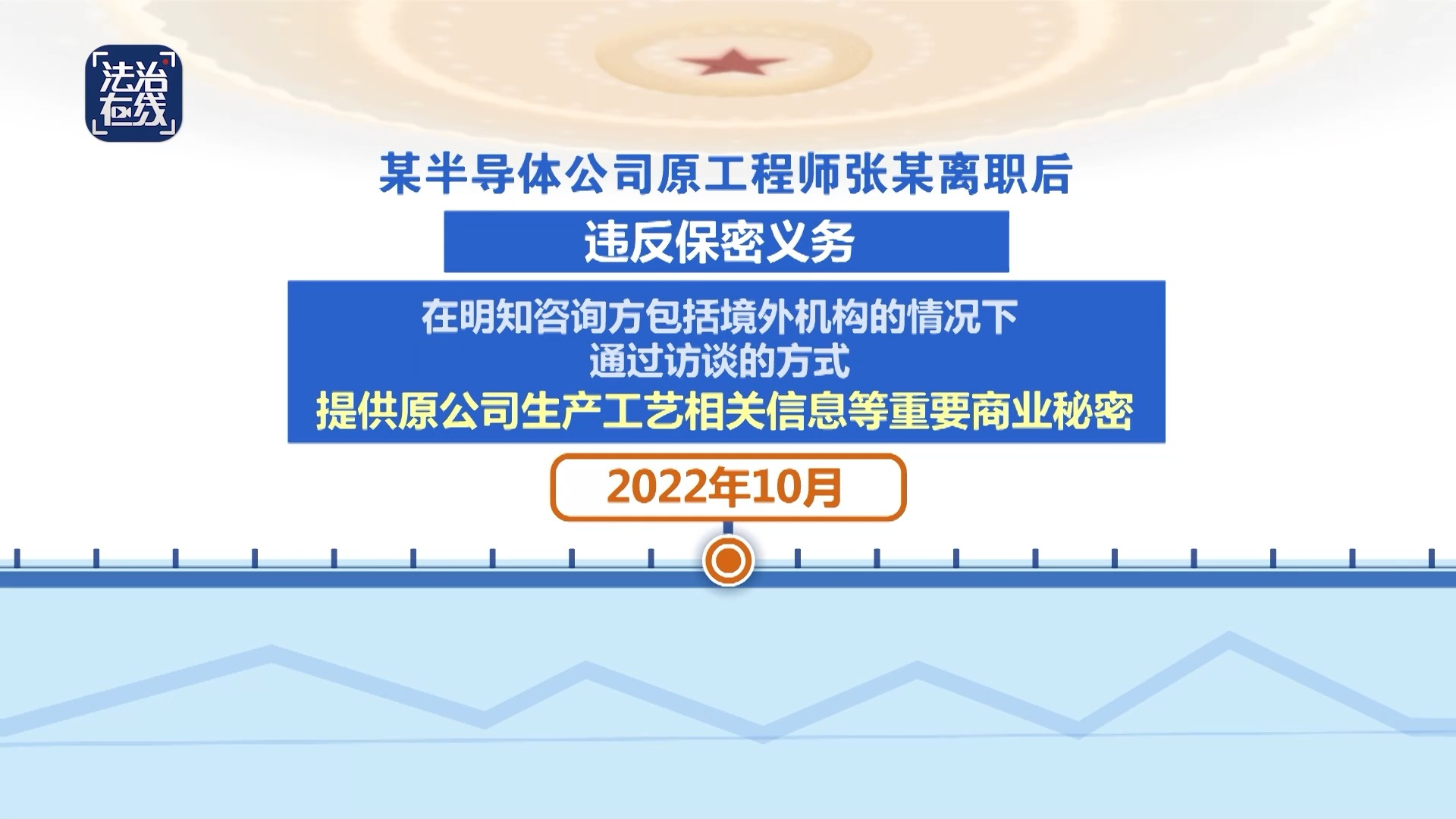 2022年10月,某半导体公司原工程师张某离职后,违反保密义务,在明知咨询方包括境外机构的情况下,通过访谈的方式提供原公司生产工艺相关信息等重要商业秘密。2024年12月,浙江检察机关依法以涉嫌为境外非法提供商业秘密罪对张某提起公诉。2025年5月,法院判处张某有期徒刑。检察机关精准打击商业间谍行为,筑牢高新技术企业知识产权与核心技术安全防线。