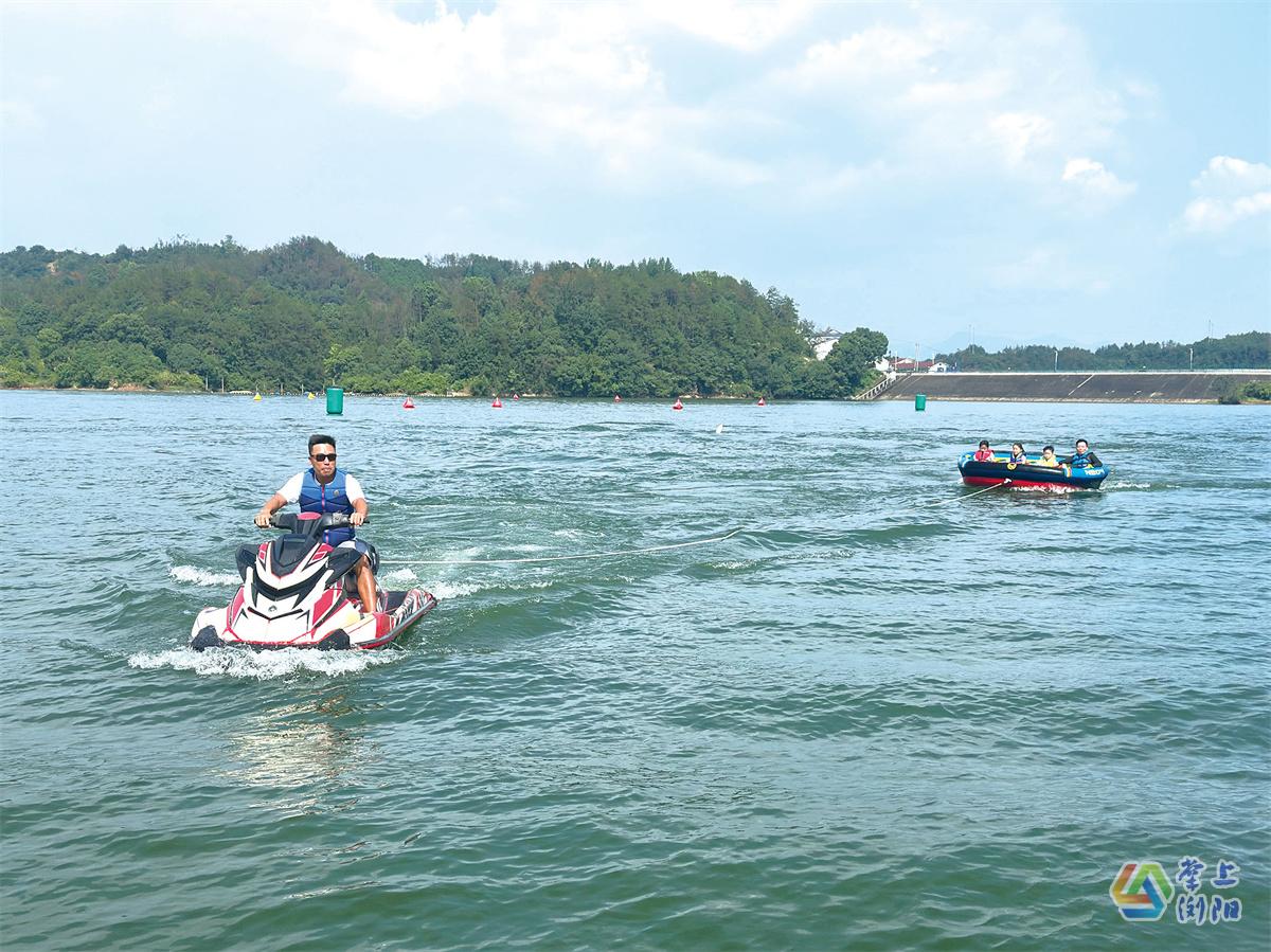 赤马湖上,游客在摩托艇的牵引下体验“水上沙发”项目。