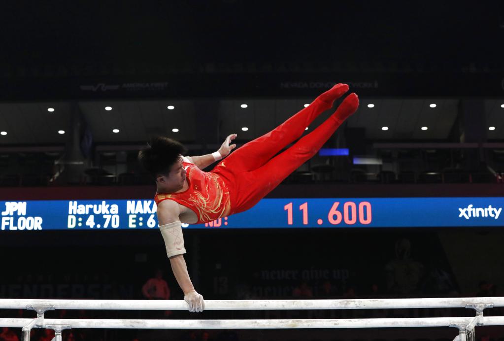 3月7日,中国队选手张杨煜在男子双杠比赛中。新华社发(曾慧摄)