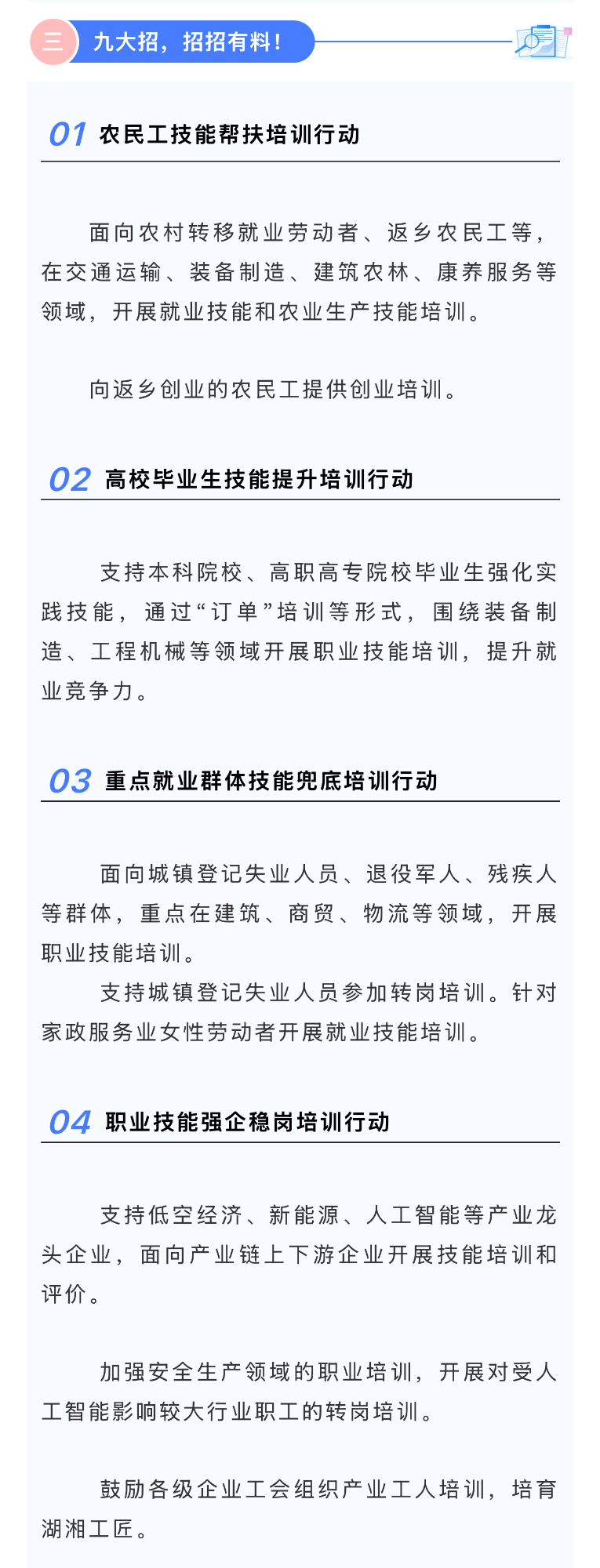 ——围绕先进制造、数字经济、低空经济、交通运输、农业农村、生活服务等热门赛道,给农民工、高校毕业生等重点群体送上“技能加速器”,即全面铺开九大专项培训行动,让有培训就业意愿的劳动者拥有一技之长,让有一技之长的劳动者实现多技多能。