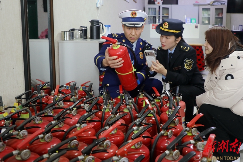 3月9日,工作人员通过扫码比对查验灭火器是否达标。当天,常德市消防、市场监管、公安等部门联合开展“3·15”消防产品专项检查行动,重点检查灭火器、水带和水枪等消防产品,查处假冒伪劣及不合格产品,现场收缴问题产品,从源头消除消防安全隐患。陈自德 摄(湖南图片库)