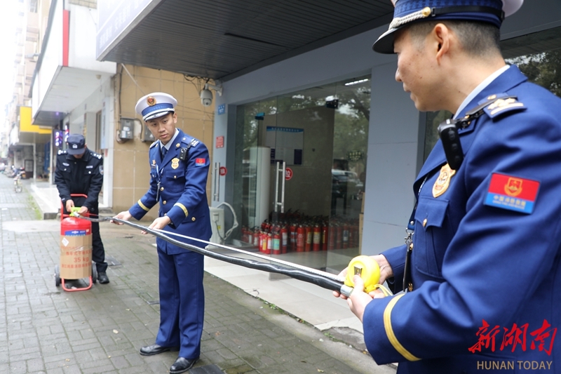 3月9日,工作人员在检测灭火器喷射软管长度是否符合标准。当天,常德市消防、市场监管、公安等部门联合开展“3·15”消防产品专项检查行动,重点检查灭火器、水带和水枪等消防产品,查处假冒伪劣及不合格产品,现场收缴问题产品,从源头消除消防安全隐患。陈自德 摄(湖南图片库)