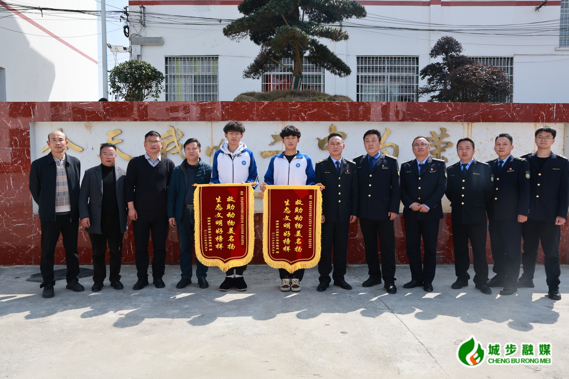 近日,湖南南山国家公园管理局、城步苗族自治县委宣传部工作人员专程来到城步二中,向该校学生向振宇、毛羊城赠送锦旗,表彰他们深夜救助国家二级保护动物毛冠鹿的善举。
