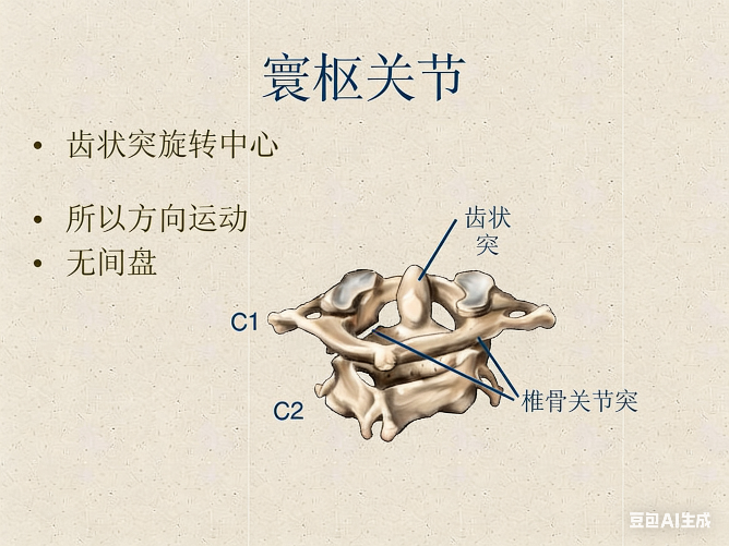 • 枢椎(C2):有一个像“齿突”一样的凸起,正好嵌入寰椎的环内,在寰椎横韧带的包裹下,形成了一个可以旋转的枢纽。