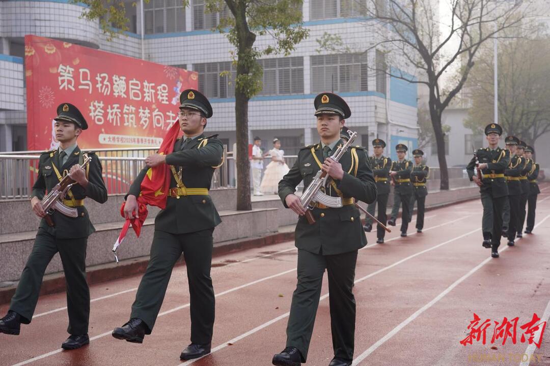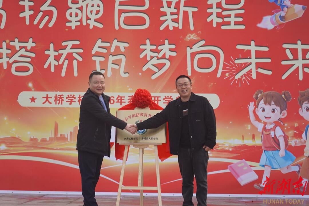 科教新报·新湖南客户端讯(通讯员 张洁婷)春回大地,马年新程开启。3月10日上午,湘潭市岳塘区大桥学校全体师生齐聚,举行2026年春季开学典礼,湖南工程学院武装部副部长张军及民兵连国旗护卫队受邀参与。