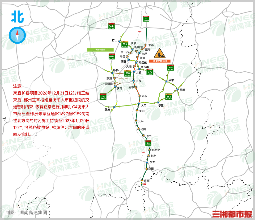 记者了解到,耒宜、株耒扩容项目南往北方向半幅封闭施工将于3月16日12时同步启动,分别于12月31日12时、2027年1月20日12时结束,管制措施动态调整。2026年12月31日12时后郴州宜章枢纽至衡阳大市枢纽段的管制解除,恢复正常通行,衡阳段从大市枢纽起往北(5个枢纽、5个收费站)的管制,保留至2027年1月20日12时。