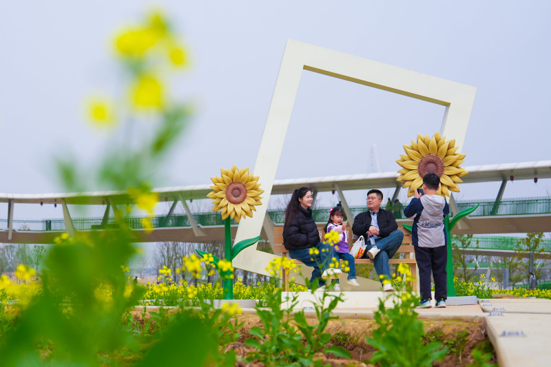 Residents and tourists have fun among the sea of canola flowers in the Daze Lake Near-Natural Wetland Park.