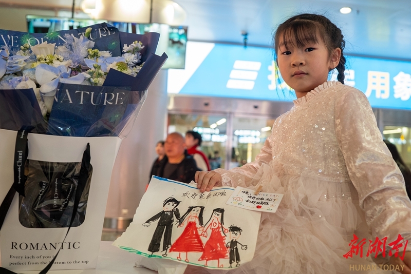3月10日晚,长沙黄花国际机场,小女孩展示亲手给父亲准备的礼物。湖南日报全媒体记者 童臻熙 周阳乐 摄影报道
