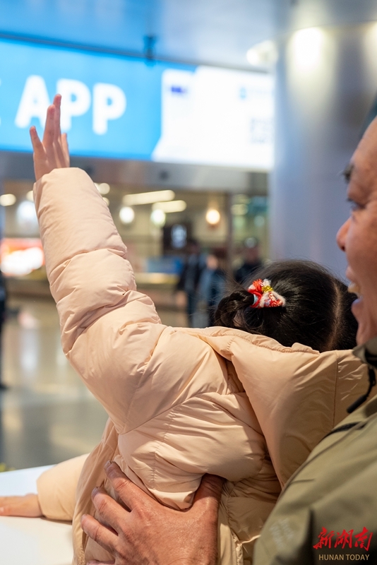 3月10日晚,长沙黄花国际机场,小女孩向母亲挥手致意。湖南日报全媒体记者 童臻熙 周阳乐 摄影报道
