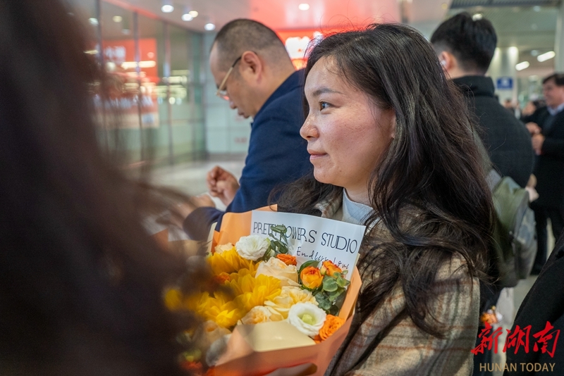 3月10日晚,长沙黄花国际机场,家属手捧鲜花耐心等待亲人归国。湖南日报全媒体记者 童臻熙 周阳乐 摄影报道