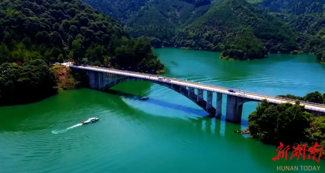 丙申春末夏初,乍暖还寒。余邀文友,从资兴市区经过兴宁直奔天鹅山。车窗外巍巍群山如一道道绿色屏障,飞速向后退去,满眼翠绿,令人目不暇接。车在弯弯曲曲的环湖公路上蜿蜒前行,绿玉般的湖水宛如明镜,映衬着郁郁葱葱的青山和蓝天白云。我渐渐地陶醉在绿色的世界里,沉浸在充满诗情画意的梦境中。碧波荡漾的湖面上,一道长虹横跨两座大山,那就是天鹅山大桥。伫立桥头,举目相望,桥高80余米,长200米,雄伟壮观的大桥,委实令人惊叹。登桥入园,凉风阵阵,空气清新,顿觉神清气爽。