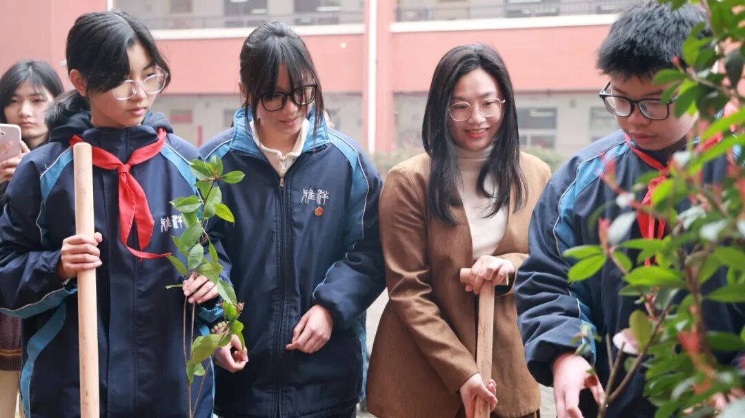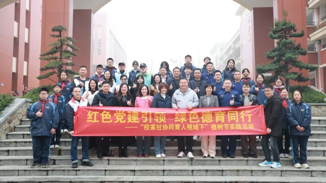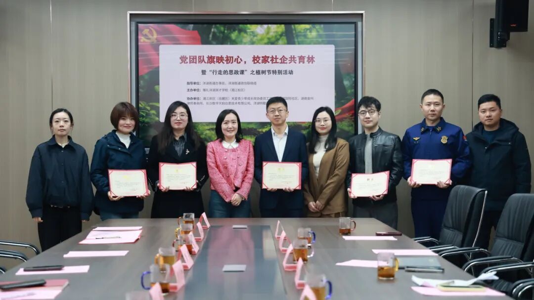新湖南客户端3月12日讯(通讯员 安璐 唐雅芳)在2026年植树节来临之际,为进一步深化党建引领下的协同育人实践,引导广大师生在实践中涵养生态文明理念、厚植家国情怀,湖南湘江新区雅礼洋湖英才学校(湘江校区)联动洋湖街道办事处、洋湖街道政协联络组、湘江新区(岳麓区)关爱青少年成长政协委员工作室、洋湖国际社区、湖南金州律师事务所、长沙数字天蚂信息技术有限公司、洋湖特勤消防救援站等单位代表,汇聚校家社企多方力量,以“党团队旗映初心 校家社企共育林”为主题,举办了2026年植树节暨“行走的思政课”特色活动。