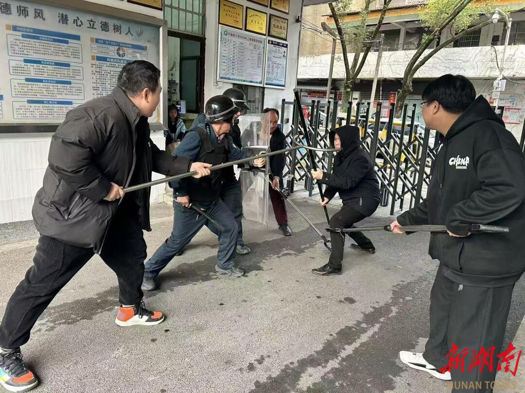 下午5时许,随着一声急促的警报声,演练正式进入实战环节。一名由教师扮演、面戴口罩的“歹徒”手持凶器,试图强行翻越校门闯入校园。险情发生后,正在值班的保安员第一时间触发“一键式报警”系统,并迅速通过对讲机向学校应急指挥部报告。接到指令后,学校应急防暴小组迅速响应。只见三名安保人员呈战术队形包抄至“歹徒”两侧:一人手持防暴钢叉,看准时机猛地叉住“歹徒”腰部,将其牢牢锁定在墙角;另一人迅速用盾牌护住队友侧翼,抵挡“歹徒”挥舞的凶器;随后赶来的教师则利用长棍精准击打,控制其活动范围。三人分工明确、配合默契,整个过程动作干净利落,从发现险情到成功控制“歹徒”并带离现场,全程仅用时两分钟,充分展现了“最小应急单元”的快速反应与高效协同作战能力。