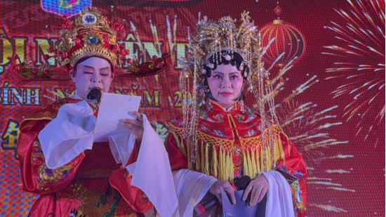 考察尾声恰逢元宵节,团队前往胡志明市第五郡华人聚居区,探寻中华文化海外传播足迹。当地会馆是华人联谊与文化传播的前沿,潮州义安会馆献演的经典潮剧,锣鼓铿锵、潮韵悠扬,不仅吸引潮州乡亲,更赢得广肇乡亲和京族同胞喜爱,场场爆满,见证了中华文化的海外影响力。