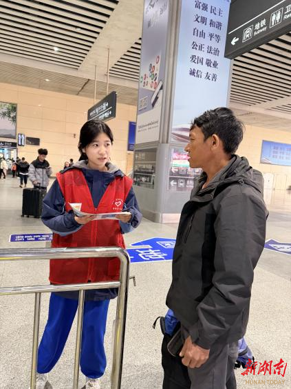 科教新报·新湖南客户端讯 (通讯员 谭睿瑞)3月7日下午2点至5点,长沙市南雅中学初三2311班的25名同学,在教师尹尧阶、梁英的带领下,走进长沙火车南站,参与2026年湖南省“暖冬行动·情满旅途”春运志愿服务活动,将一堂生动的“行走的思政课”搬进了车站大厅。