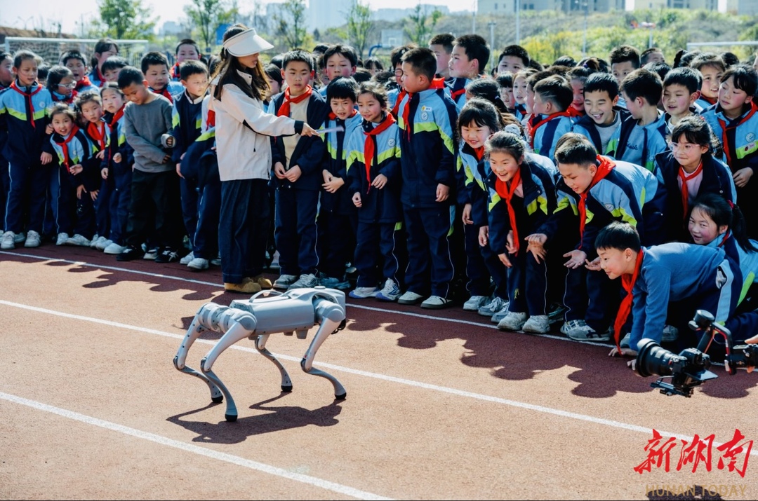 旋律落下,科技的精彩如约而至。“蓝天起航·科技未来”篇章中,机器狗灵动互动,引得阵阵欢呼;航模在蓝天穿梭、盘旋、翱翔,炫酷特技让同学们目不暇接,科技的魅力在心中悄然生根。