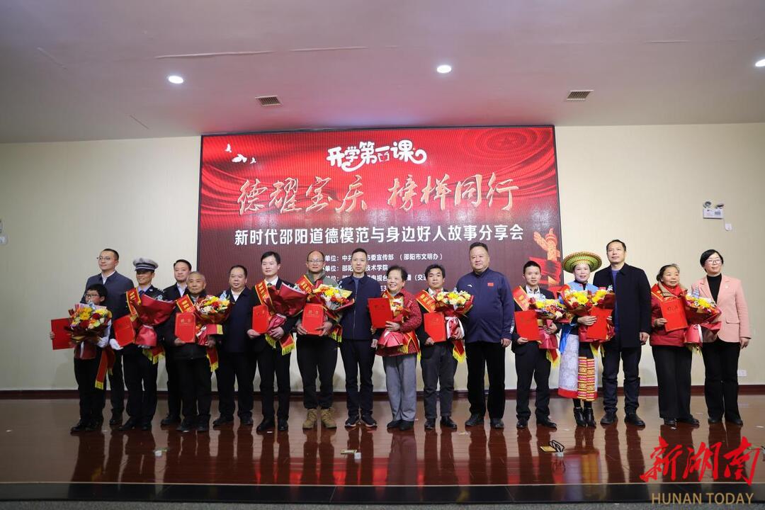 科教新报·新湖南客户端讯(通讯员 伍菲)3月10日下午,邵阳职业技术学院图书馆五楼报告厅内掌声阵阵,一场别开生面的“开学第一课”在此开讲。由中共邵阳市委宣传部、邵阳市文明办主办,邵阳职院承办的“德耀宝庆 榜样同行”新时代邵阳道德模范与身边好人故事分享会顺利举行,为在场师生带来了一堂生动而深刻的“行走的思政课”。