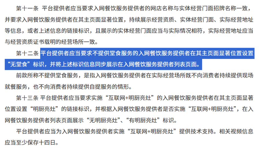 《规定》明确,不提供堂食服务的入网餐饮服务提供者,应当在其主页面显著位置设置“无堂食”标识,平台提供者应当要求入网餐饮服务提供者做到这一点,并将上述标识信息同步展示在入网餐饮服务提供者列表页面。