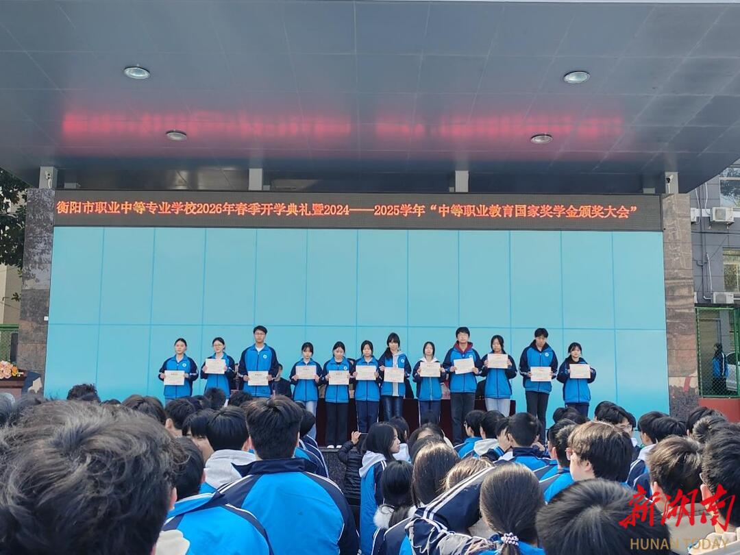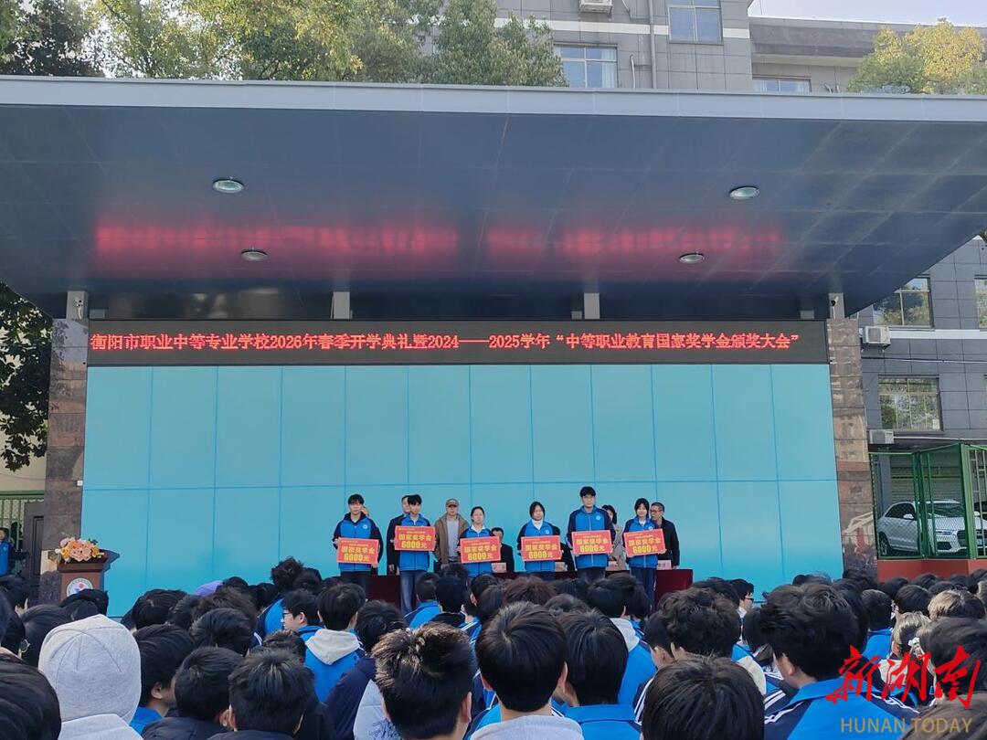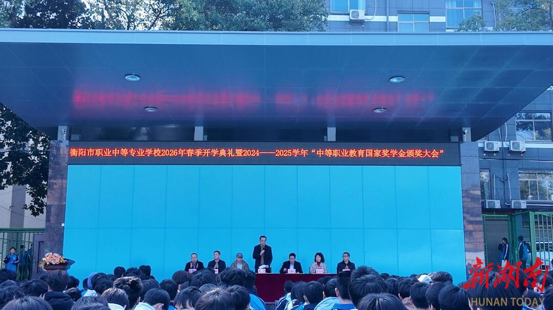科教新报·新湖南客户端讯(通讯员 罗金华)为表彰先进、鼓舞士气,凝聚奋进力量,3月11日上午,衡阳市职业中等专业学校全体师生齐聚运动场,举行2026年春季开学典礼暨国家奖学金颁奖仪式,共同见证荣耀时刻,开启新学期奋斗篇章,学校全体在家领导班子出席,仪式由党委委员唐连三主持。
