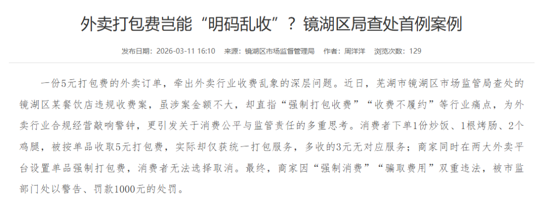 3月11日,安徽省芜湖市镜湖区市场监管局查处了一起典型的外卖打包费违规案件:消费者下单1份炒饭、1根烤肠、2个鸡腿,被按单品收取5元打包费,实际却仅获统一打包服务,多收的3元无对应服务。商家同时在两大外卖平台设置单品强制打包费,消费者无法选择取消。