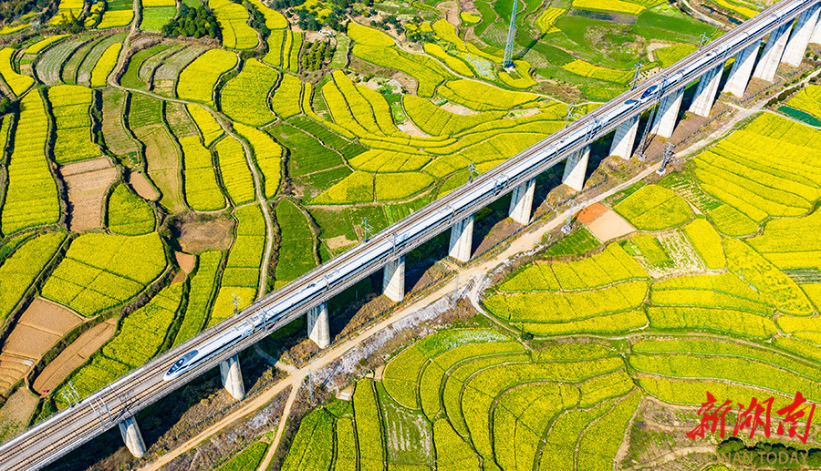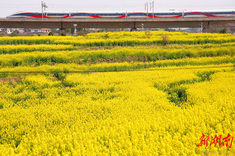 3月13日,中方县境内,金色的油菜花田与疾驰的沪昆高铁列车、远山村落相映成趣,勾勒出春日乡村的生机图景。 田文国 摄(湖南图片库)