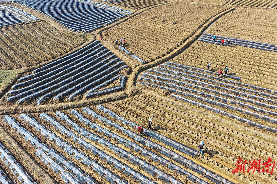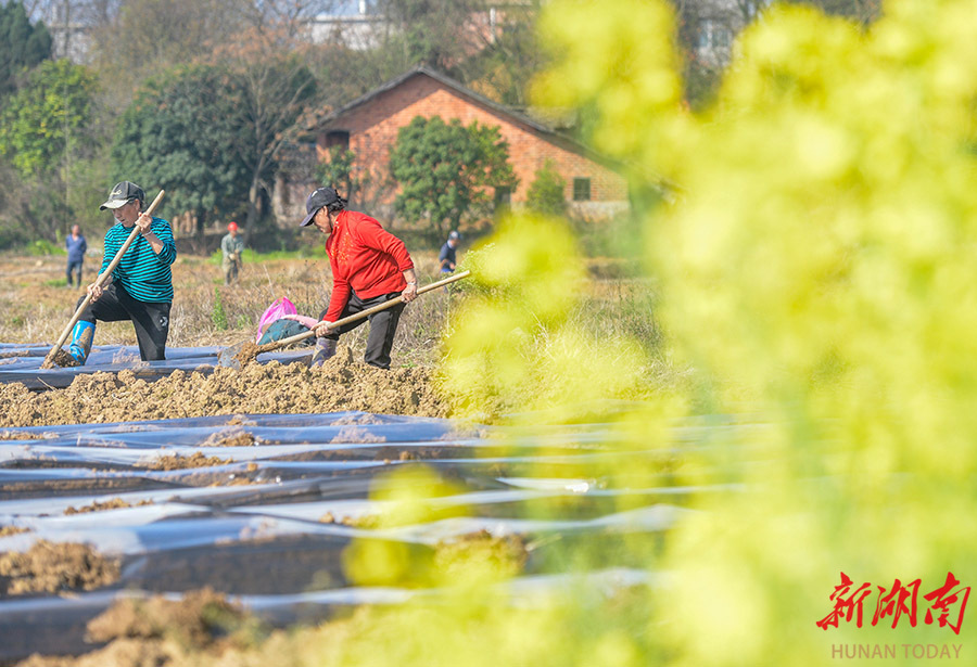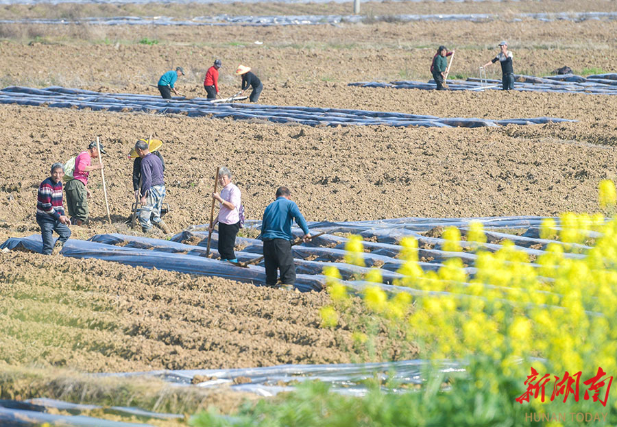 3月13日,道县白马渡镇东山村,农民在田间覆盖地膜。随着天气回暖,当地农民抢抓农时,积极投入春耕生产,田间地头一片繁忙景象。 蒋克青 摄(湖南图片库)