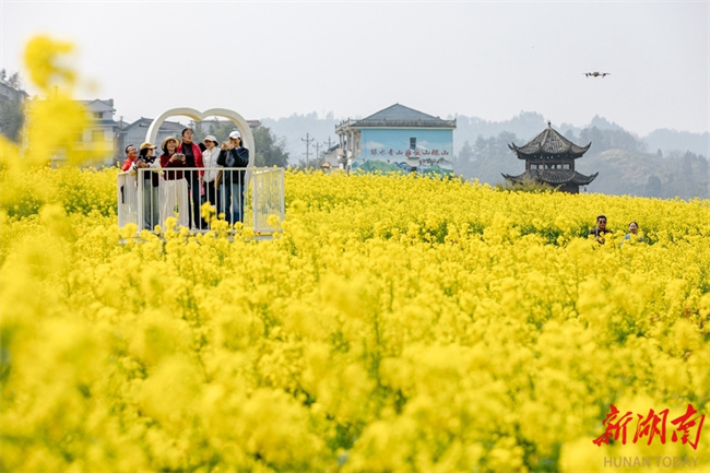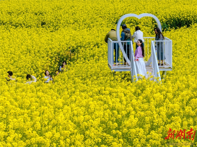 The photo shows visitors taking photos amid a sea of canola flowers at Luowen Village, Nanxian County. As the spring season comes, flowers are in full bloom across Hunan. People are taking advantage of the fine weather to enjoy spring outings and admire the flowers, savoring the delightful moments of spring. (Photo/Xiao Lefeng)