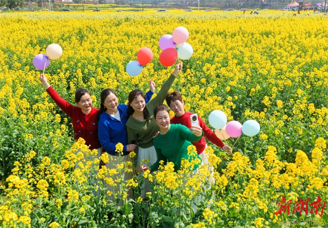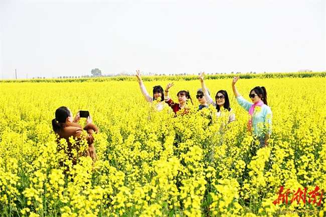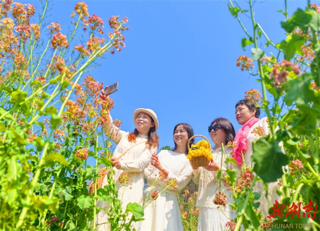 The photo shows tourists posing for photos amid a sea of golden canola flowers at Qiaojiahe Community, Linan Town, Lixian County. As the spring season comes, flowers are in full bloom across Hunan. People are taking advantage of the fine weather to enjoy spring outings and admire the flowers, savoring the delightful moments of spring. (Photo/Bai Yipu)