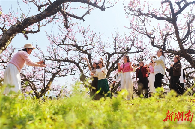 The photo shows tourists taking photos at a peach blossom garden in Dadong Village, Taipingxu Town, Lanshan County. As the spring season comes, flowers are in full bloom across Hunan. People are taking advantage of the fine weather to enjoy spring outings and admire the flowers, savoring the delightful moments of spring. (Photo/Huang Chuntao)