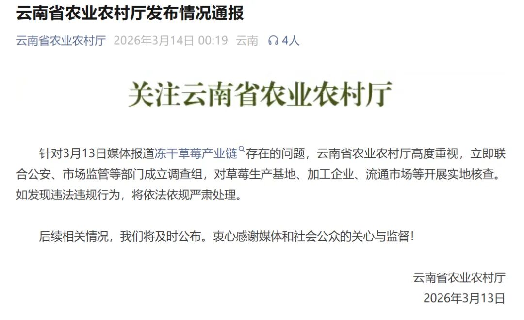 记者从云南省农业农村厅获悉,针对3月13日媒体报道冻干草莓产业链存在的问题,云南省农业农村厅已联合公安、市场监管等部门成立调查组,对涉及的三个州(市)的草莓生产基地、加工企业、流通市场等开展实地核查。如发现违法违规行为,将依法依规严肃处理。