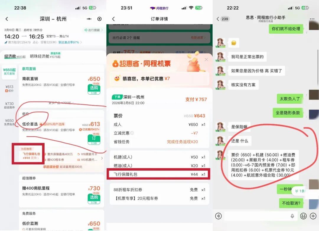 3月7日,邓女士在同程旅行平台预订了3月10日从深圳飞往杭州的机票,并选择了显著标有“低价首选”的613元的选项。但进入到支付环节时,应付金额被拉高至757元。