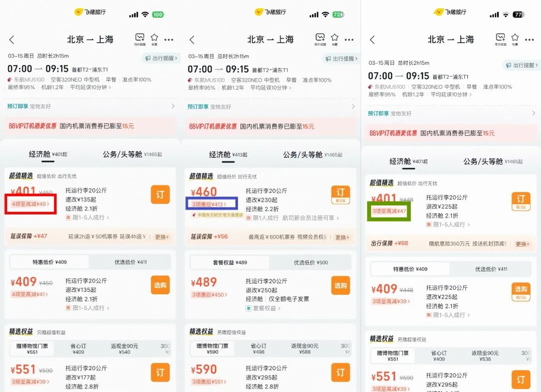 记者3月11日(左图红框)、3月12日(中间蓝框)、3月14日(右图绿色)搜索机票时的价格描述不停发生变化。
