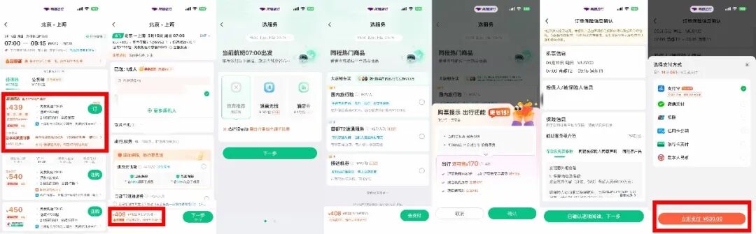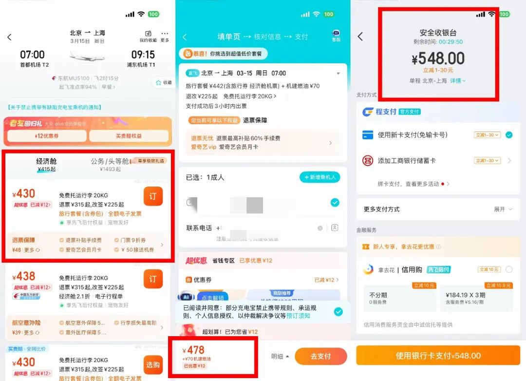 记者在同程旅行旅行购票,各个步骤及价格展示。