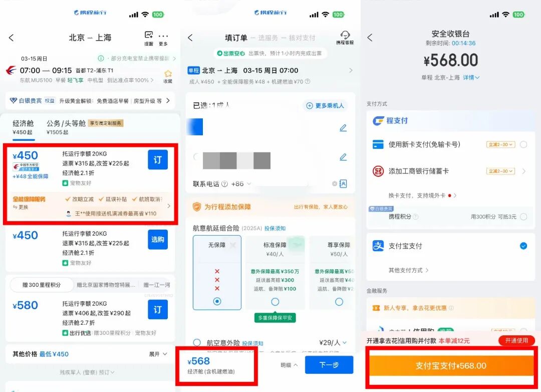 在携程旅行APP,被置于首位推荐的选项以较大字体标注450元,但在点进下一页面后,显示的最终支付价格为568元,除去70元的机建燃油费用,还默认附带了48元的“全能保障服务”,而这一附带产品在首页只是以“+48元”的小字显示。