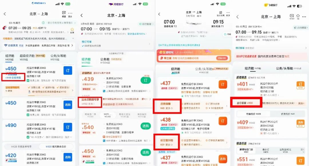 携程旅行、同程旅行、去哪儿、飞猪等多个在线旅游平台上,都可看到小字标注的“+附加产品”。