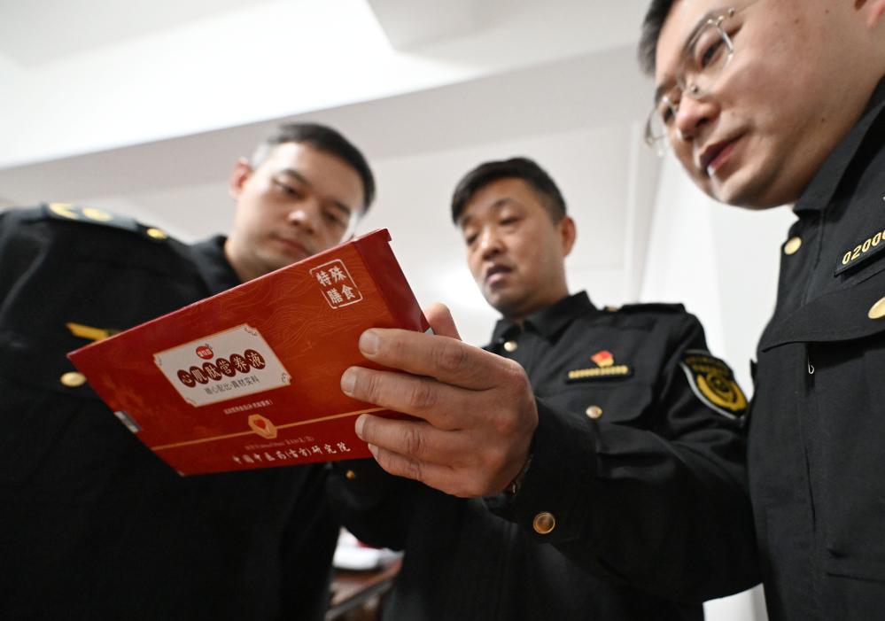▲天津市市场监管综合行政执法总队工作人员在查看涉案的直播间产品。