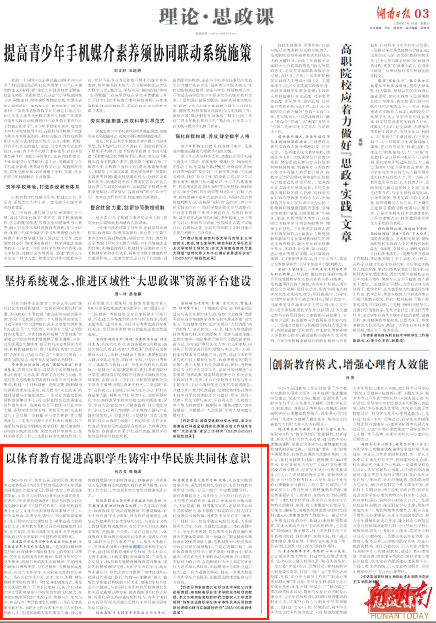 【作者分别系湖南机电职业技术学院公共课部副教授、湖南机电职业技术学院宣传统战部教授。本文为湖南省高校新时代立德树人工程资助项目“体育促进高职学生铸牢中华民族共同体意识的逻辑机理与实践路径研究”(25A146)阶段性成果】