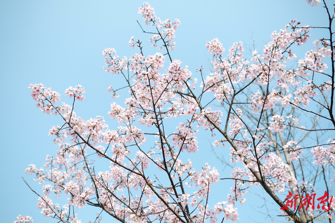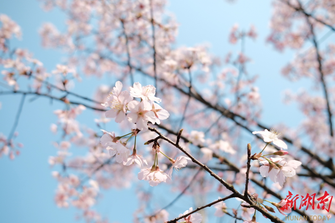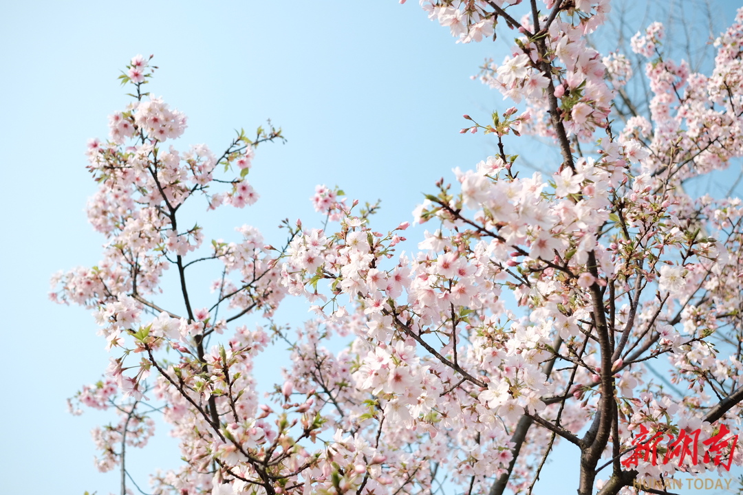 近日,永州市冷水滩区宋家洲公园樱花迎来盛花期,成片粉白樱花竞相绽放,与湘江风光相映成景,美不胜收。周末晴好天气,大批市民游客前来踏青赏花,漫步花间步道、拍照打卡,尽情享受春日美景。(湖南日报全媒体记者 郭利 摄)