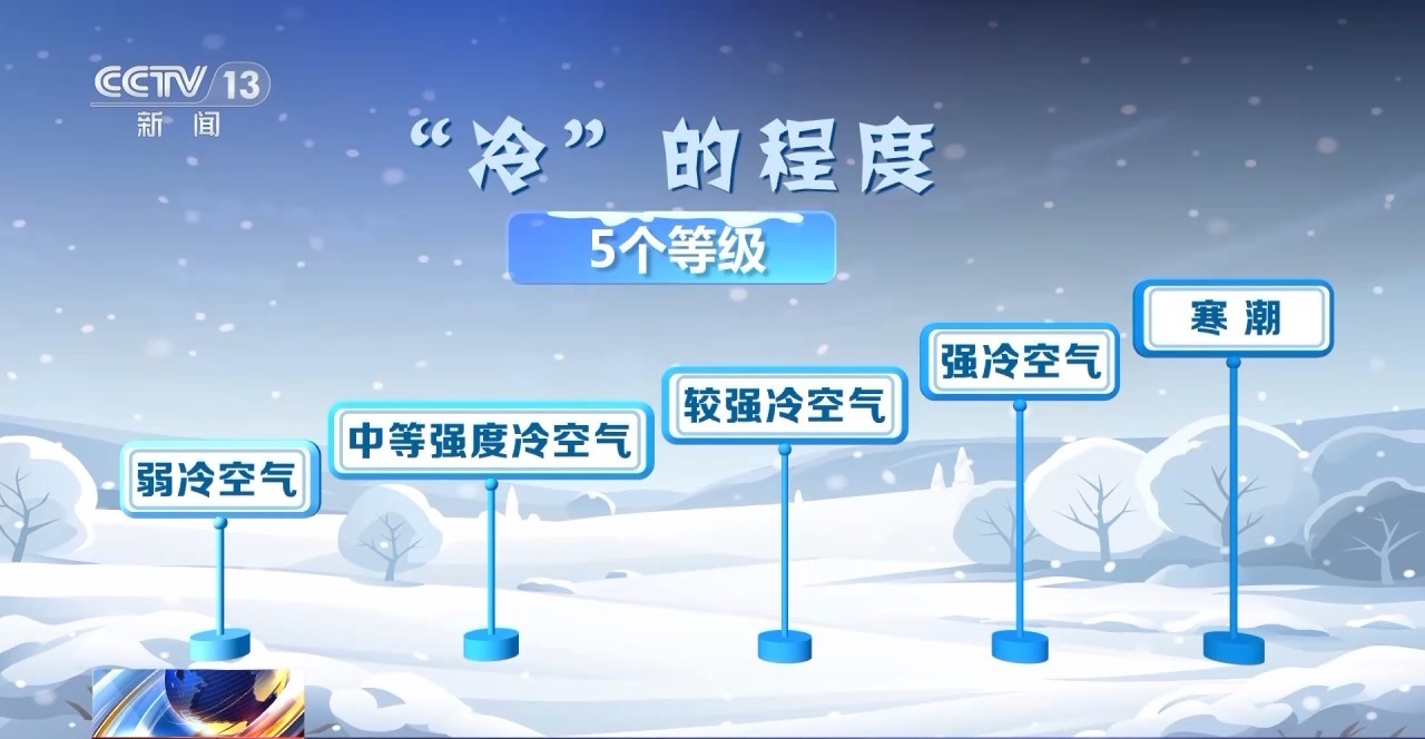 “冷”的程度可分为5个等级,分别是弱冷空气、中等强度冷空气、较强冷空气、强冷空气以及寒潮。而日常生活中人们的体感温度往往还会受到光照、风力、空气湿度等影响,例如明明天气预报中的降温幅度不大,但还是感觉很冷,这可能就是“风寒效应”,大风会加速人体与环境之间的热量交换,让人感觉更冷。