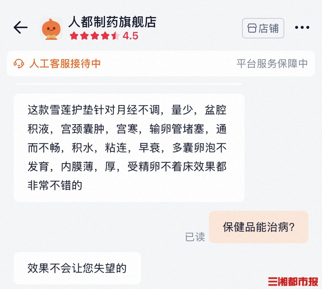 “这款护垫用于去异味,止痒、抑菌、杀菌、妇科炎症效果很不错。”客服介绍。记者以消费者身份追问“保健品是否能治病”,客服表示“效果不会让人失望”。