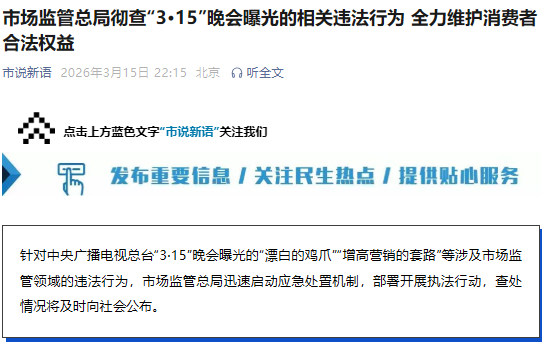 针对中央广播电视总台“3·15”晚会曝光的“漂白的鸡爪”“增高营销的套路”等涉及市场监管领域的违法行为,市场监管总局迅速启动应急处置机制,部署开展执法行动,查处情况将及时向社会公布。