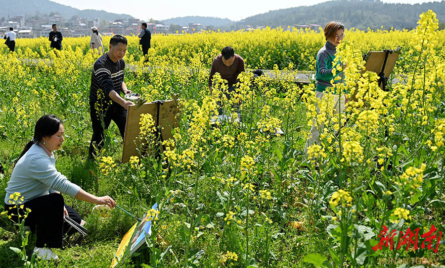 3月15日,洞口县美术家协会组织会员在石江镇江潭村油菜花田开展写生活动。美术爱好者们用画笔记录春日田园风光,在自然采风中激发创作灵感。 滕治中 摄(湖南图片库)