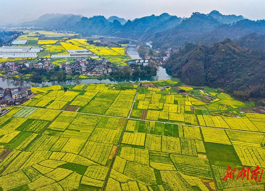 3月15日,通道侗族自治县万佛山镇油菜花迎春绽放。金黄花海与山水村落相映成趣,构成春日乡村画卷。近年来,该县通过人居环境整治,推动美丽乡村建设取得显著成效。 李尚引 摄(湖南图片库)