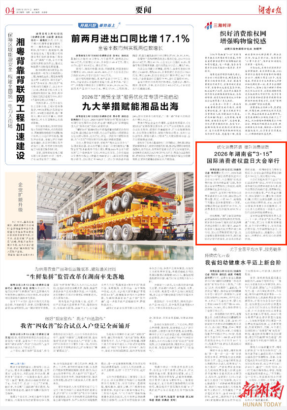 湖南日报3月14日讯(文/图 全媒体记者 李成辉 通讯员 周欣)3月13日,由湖南省市场监管局、省消保委联合主办的2026年湖南省“3•15”国际消费者权益日大会在长沙举行。大会以“优化消费环境 提升消费品质”为主题,集中展示全省消费维权工作成效,凝聚消费维权社会共治合力。