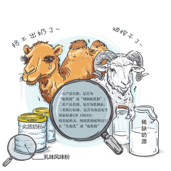 业内专家提示,消费者要学会看懂商品标签。武汉轻工大学食品科学与工程学院副教授方敏等专家提供了简单易行的“四步鉴别法”:一看产品名称,是否为“驼乳粉”或“调制驼乳粉”;二看产品类别,是否为乳制品;三看执行标准,是否为食品安全国家标准GB 19644;四看配料表,纯驼乳粉配料应只有“生驼乳”或“驼乳粉”,调制驼乳粉配料中“生驼乳”或“驼乳粉”应该排在第一位。若配料表首位是燕麦粉或麦芽糊精等成分,则表明该产品不是骆驼乳粉或骆驼调制乳粉。