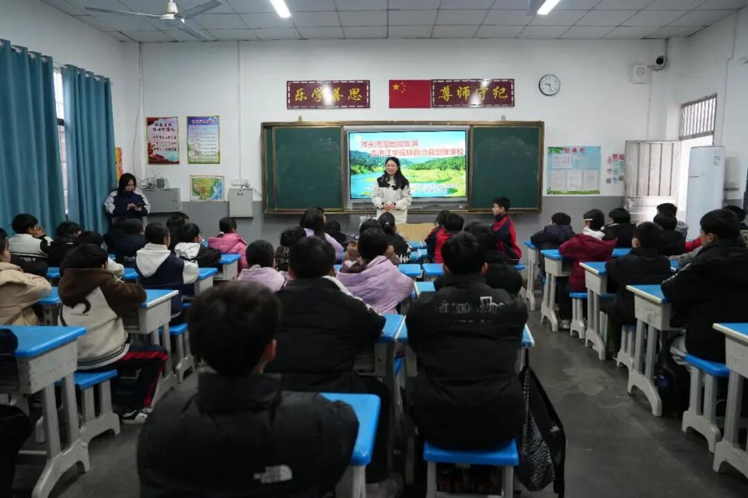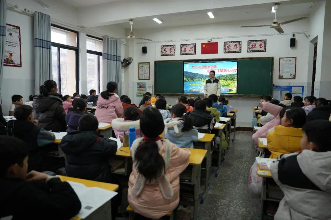 江华瑶族自治县涔天河国家湿地公园管理局紧扣“世界湿地日”主题,于2026年1月组建专业宣讲团,走进沱江镇七小、县职业中专、剑雄学校等,开展“湿地科普进校园”系列活动,为两百余名师生送上别样“生态年货”。宣讲团结合小学、初中、职高不同年龄段学生的认知特点,定制差异化科普内容:小学阶段侧重趣味启蒙,通过绘本故事、标本展示,讲解候鸟迁徙的奥秘;初中阶段侧重知识拓展,结合湿地案例剖析“地球之肾”的功能,并开展有奖问答调动积极性;职高阶段侧重职业与科研导向,演示观鸟监测设备,分享湿地监测员的职业故事。活动还打造“移动宣教展厅”,布置湿地生态展板,在职业中专实现与湿地公园监测塔的云端连线,同时开展“小小湿地宣讲员”演练、绘制涔天河长卷等互动活动,让学生沉浸式感受湿地魅力,有效提升了青少年的湿地保护意识。