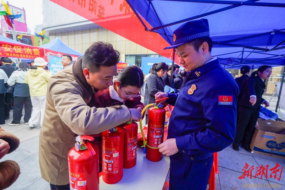 3月15日上午,在万达广场主会场,消防宣传员设立咨询展台,通过实物对比、扫码验证等方式,向市民讲解灭火器、防烟面罩等产品的辨别要点,传授“看标识、查认证、验材质”的甄别方法。赫山、资阳、桃江等地同步在广场、公园设点,开展有奖问答和实操演示,吸引众多市民参与。
