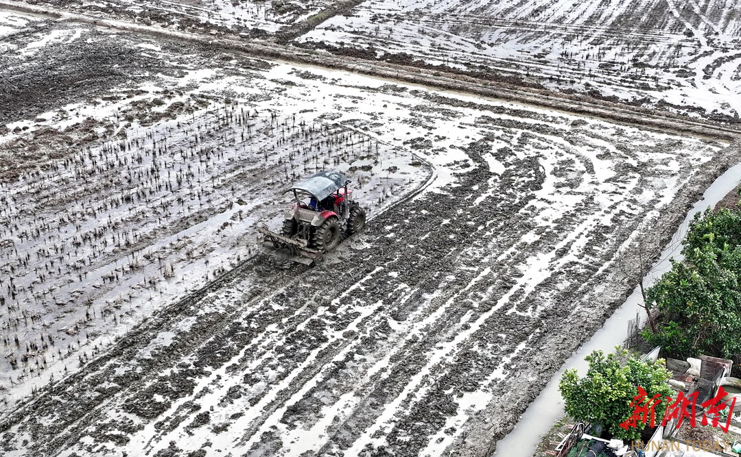 3月15日,益阳市赫山区龙光桥街道米香村村民曹国期聘请农机手驾驶耕田机在翻耕稻田,为插早稻秧苗作准备。