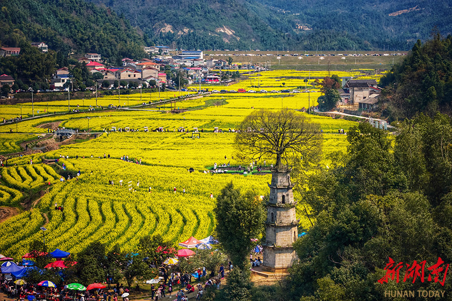 On March 14, the 10,000 mu (667 ha.) of canola flower fields in Chating Town, Wangcheng District, Changsha, entered their peak blooming period, attracting numerous visitors to enjoy the blossoms on a spring outing. In recent years, the town authority has created expansive floral landscapes through large-scale cultivation and organized accompanying events such as fun runs and concerts, to promote the integrated development of agriculture and tourism. (Photo/Tong Di, Hunan Daily)