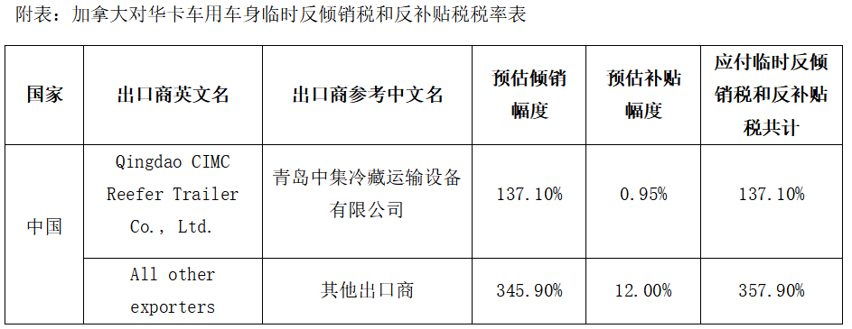 2026年3月6日,加拿大边境服务署(CBSA)对原产于或进口自中国的卡车用车身(Truck Bodies)作出反倾销和反补贴初裁,决定自当日起对涉案产品征收临时反倾销税和反补贴税(青岛中集冷藏运输设备有限公司补贴金额低于出口价格的1%,因此被认定为微量补贴。据此,针对该出口商的调查将继续进行,但在临时措施实施期间,对该出口商的涉案产品将不征收临时反补贴税。)详细税率见附表。该初裁结果的理由陈述将于15日内公布。涉案产品的加拿大海关编码为8707.90.90.10、8707.90.90.39、8707.90.90.40、8707.90.90.90和8708.29.99.90。